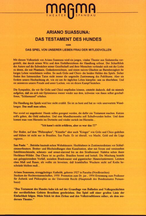 Ein Wahnsinn mit Tradition: 1952 wurde der Verein gegründet und hat im Kulturhaus Spandau seine Spielstätte gefunden. In den letzten Jahren lotete die Gruppe die Abgründe von Managern (`Top Dogs`) und die Absurdität des Arbeitsamts (`Warten auf Godot`) aus. Diesmal nimmt sie das Theater selbst aufs Korn.